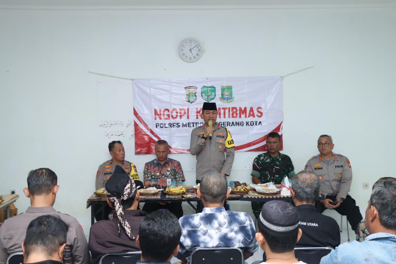 Tangerang—Dalam upaya mempererat hubungan antara kepolisian dan masyarakat, Kapolres Metro Tangerang Kota Kombes Pol Dr. Raden Muhammad Jauhari, S.H., S.I.K., M.Si. menggelar kegiatan Ngopi Kamtibmas bersama warga di Kelurahan Larangan Utara, Kecamatan Larangan, Kota Tangerang. Acara yang berlangsung pada Kamis sore (30/10/2025) tersebut dihadiri sejumlah pejabat utama Polres, unsur Forkopimcam, tokoh masyarakat, serta warga sekitar.