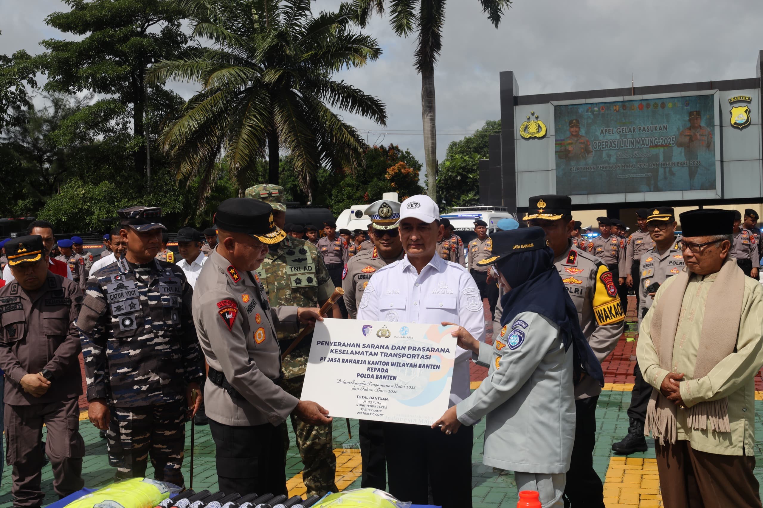 Polda Banten menerima penyerahan sarana dan prasarana keselamatan transportasi dari PT. Jasa Raharja dalam rangka Pengamanan Natal 2025 dan Tahun Baru 2026 berupa 25 Jas Hujan, 5 unit tenda taktis, 33 stick lamp, 201 traffic cone (Bidhumas). ***