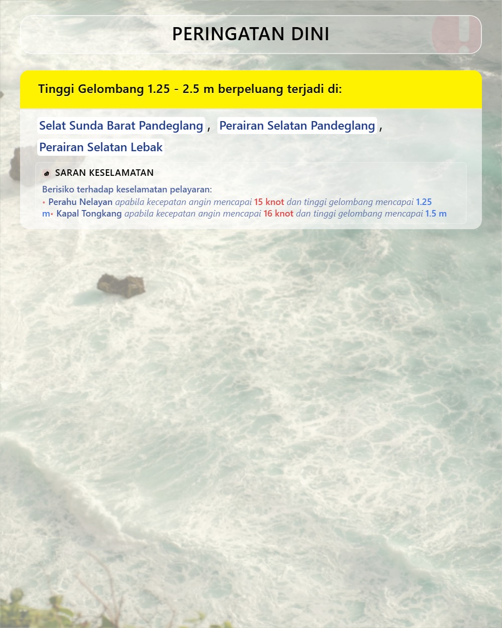 BMKG Banten juga mengeluarkan Peringatan Dini Waspada potensi hujan sedang hingga lebat disertai petir/kilat dan angin kencang di wilayah Kab. Lebak bagian Timur. Waspada potensi tinggi gelombang 1.25 – 2.5 m (Sedang) di wilayah Perairan Selatan Pandeglang, Selat Sunda Barat Pandeglang, Perairan Selatan Lebak.