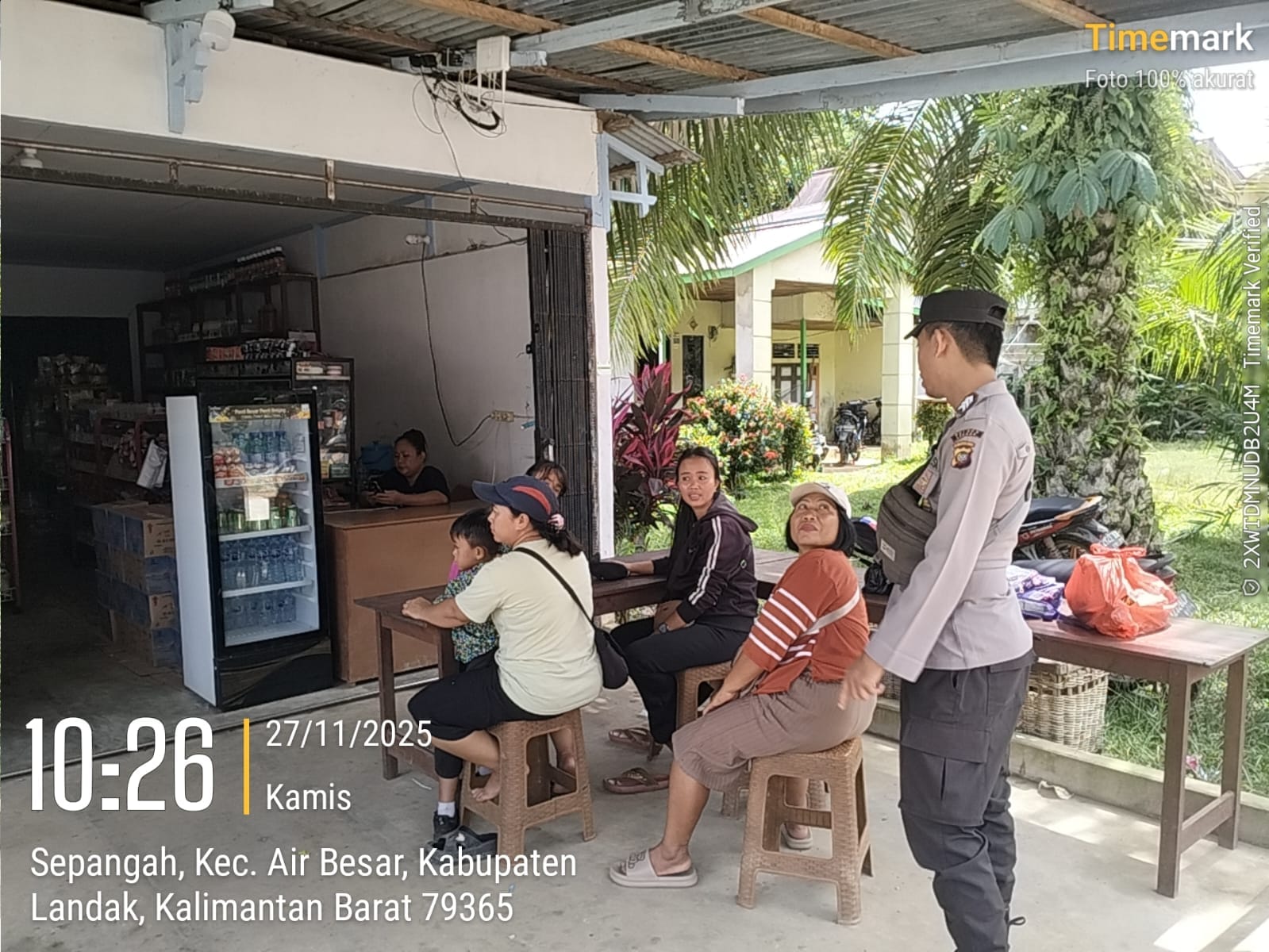 Polsek Air Besar ~ Polres Landak ~ Polda Kalbar ~ Dalam kegiatan patroli siang, Kamis (27/11/2025), personel Polsek Air Besar menyempatkan diri berhenti dan menyapa sekelompok ibu-ibu yang tengah duduk santai di depan rumah warga. Selain menjalin kedekatan dengan masyarakat, petugas juga memberikan imbauan penting terkait keamanan diri.