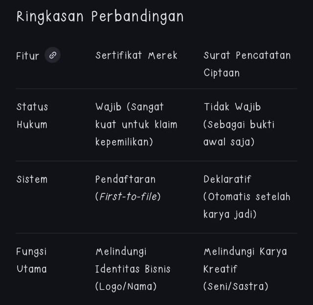 Sementara itu, Hak Merek memiliki karakter yang berbeda. Perlindungan merek ditujukan untuk identitas komersial, seperti logo, nama, atau slogan yang digunakan sebagai pembeda barang dan jasa di dunia usaha.